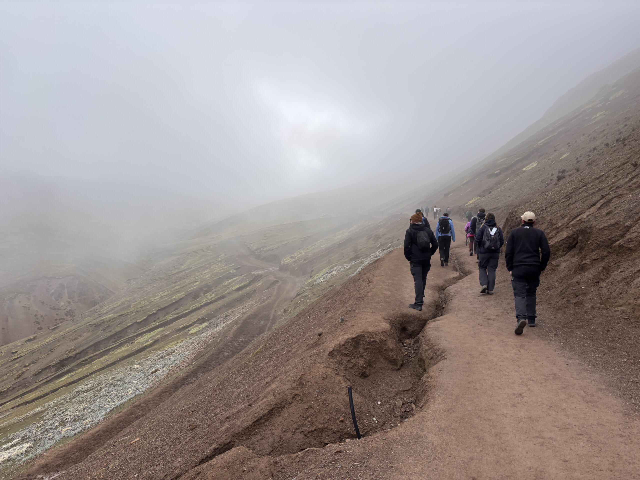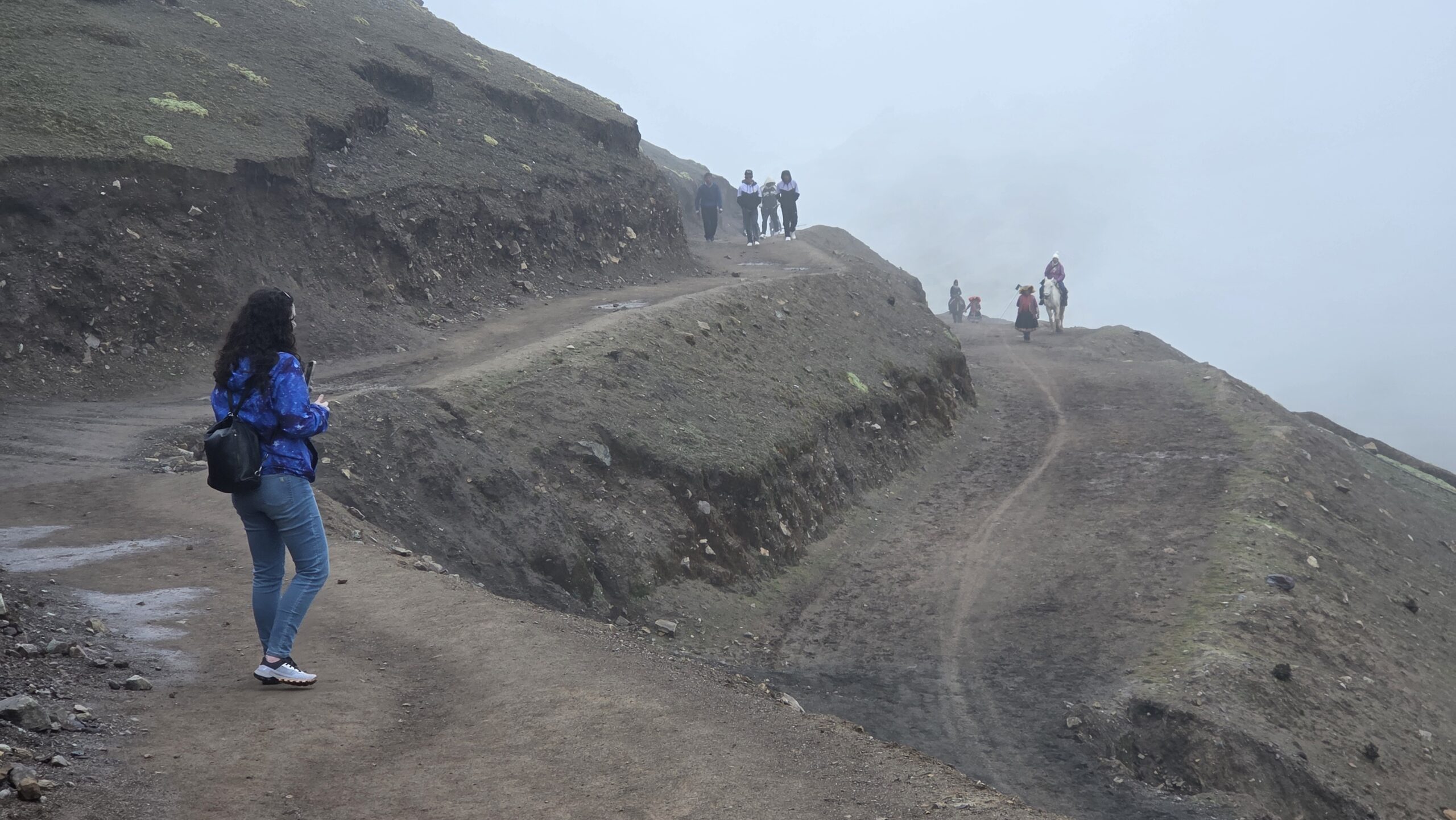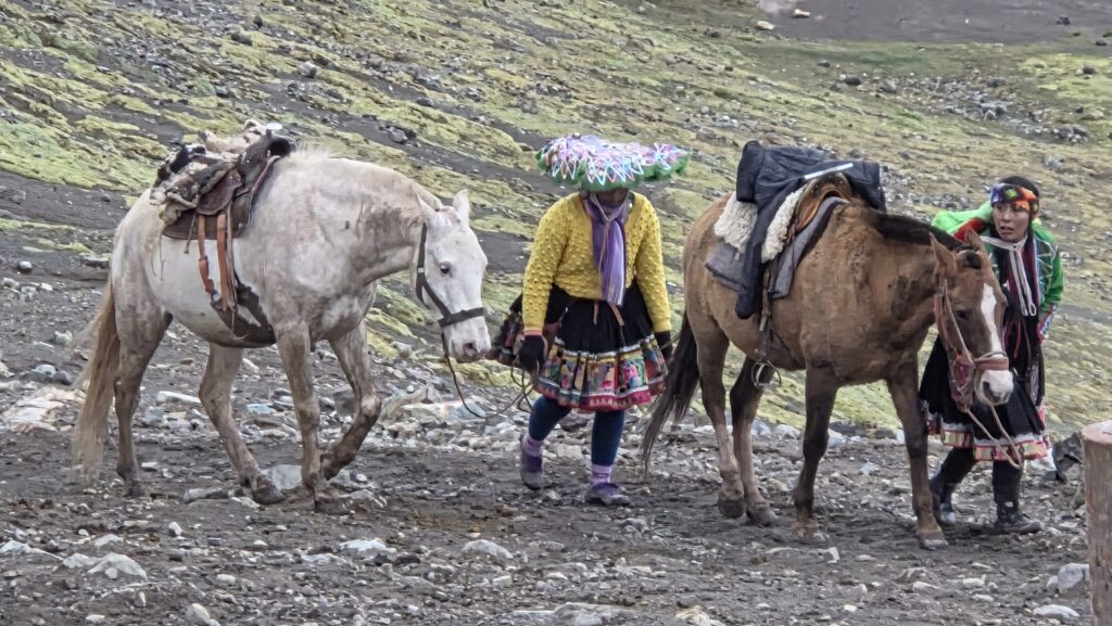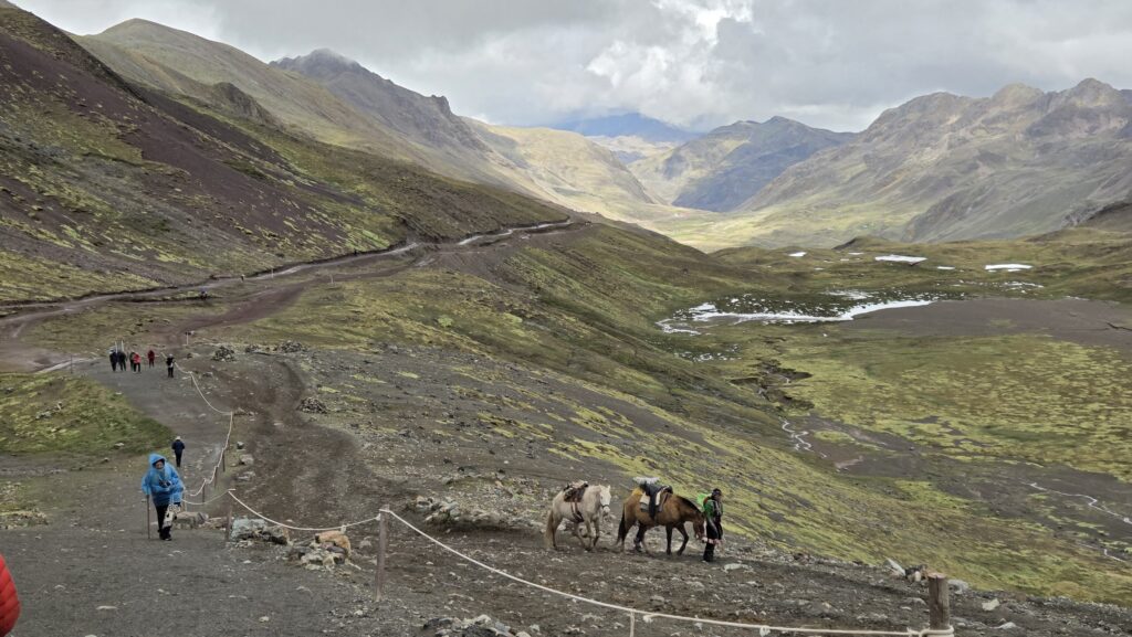 Dwie trzecie szlaku (ta łatwiejsza czesc) mozna przebyc na koniach lub osiołkach. Nawet jest duzo ochotnikow na ta podwozke bo organizm roznie reaguje na wysilek na tej wysokosci. Maja swoja wydzielona sciezke. Niestety na koniach mozna dotrzec tylko do miejsca w ktorym zaczyna sie prawdziwe wyzwanie by pokonac 200m przewyzszenia na okolo 0,5km. Tym samym nasza ekipa uszczupla sie o parę Amerykanów, ktorzy po dotarciu konno w to miejsce rezygnuja z wejscia na Teczową Góre.