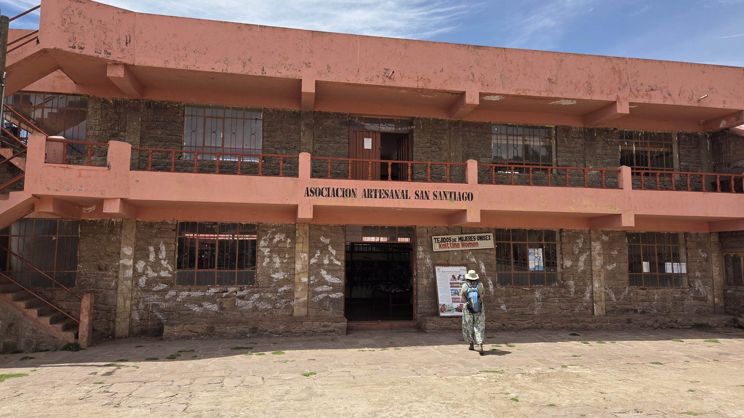 Doplywamy do wyspy Taquile. Podobno bylo to jedno z ostatnich miejsc, ktore zostalo podbite przez Hiszpanow. Jako ze hiszpani zakazali ludnosci chodzic w swoich tradycyjnych strojach przyjeli oni stroj chlopow hiszpanskich, w ktorych do dzisiaj chadzaja. Tak jak na innych wyspach uprawiaja tkactwo ale tutaj to mezczyzni a nie kobiety wykonuja je na drutach i krosnach ( tak mi się wlasnie wydawalo ze wyroby tutaj maja troche mnie atrakcyjne wzory niz na poprzedniej wyspie 😁).